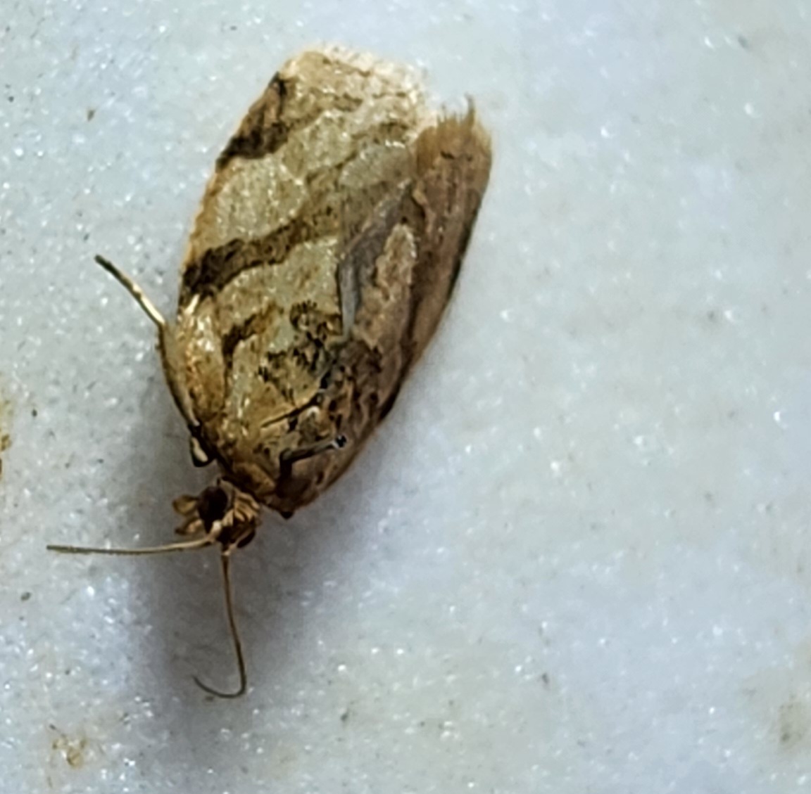 神奈川県、4月2日撮影、開翅張16ミリほど。このハマキガ、なんという種類でしょうか?可能であれば、同定したポイントなども教えて頂きたいです。
